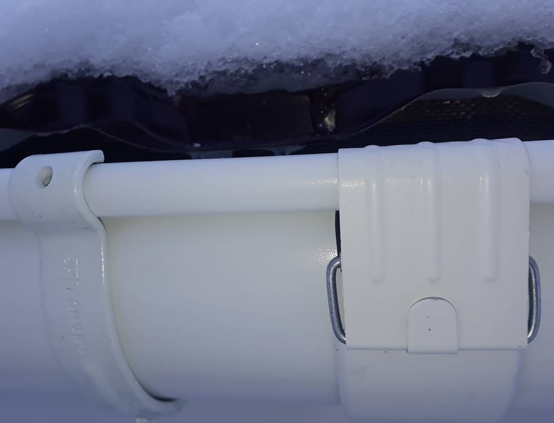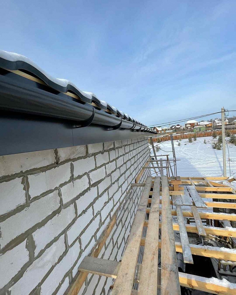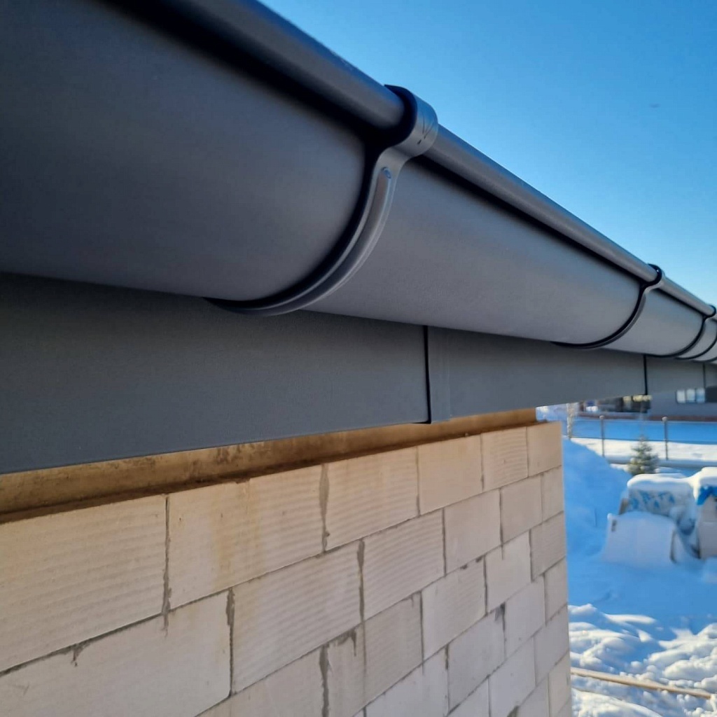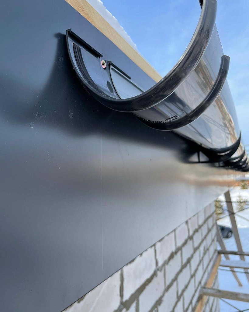 Элементы в виде кронштейнов могут прикрепляться к фронтонной доске, стропильной ноге или к настилу. После их установки осуществляется крепление желобов со стороны фронтонной доски. При монтаже желоба на первом шаге он фиксируется в задних зажимах кронштейнов, а также соединителей и воронок, после чего закрепляется в передних замках этих комплектующих.